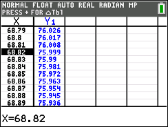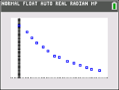 To see the scatter plot press ZOOM and #9 ZOOMSTAT, Hitting TRACE and right arrow will move along the data points.  |